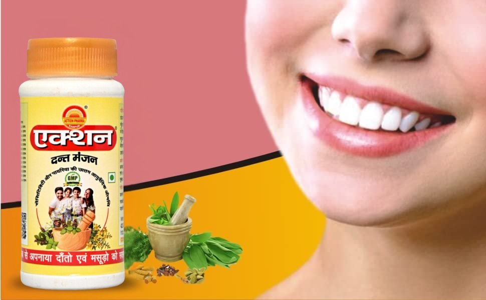 Action Dant Manjan originated from the blend of rare herbs that lead to strong teeth, prevent tooth decay, bad breath and lead to healthy gums