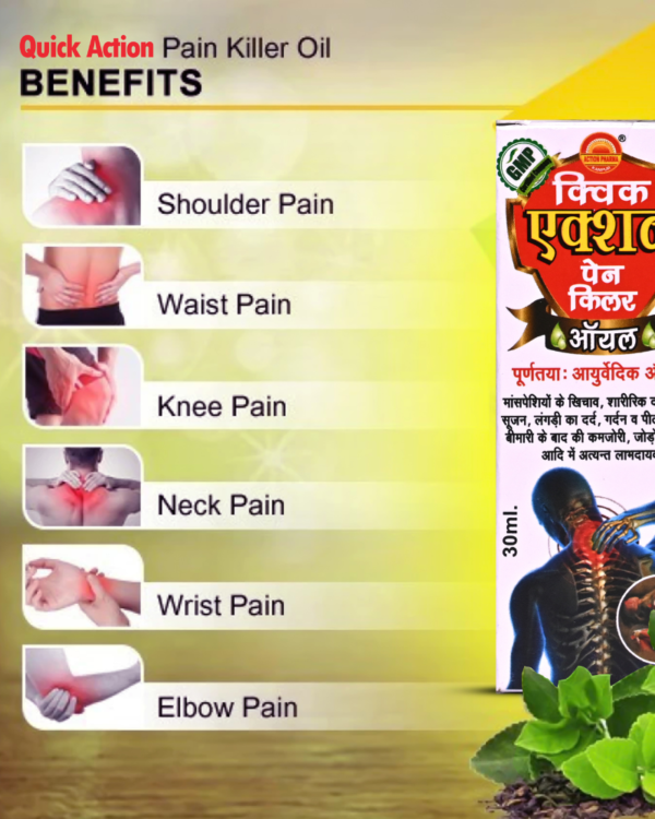 Quick Action Pain Killer Oil is manufactured from organic medicinal herbs specialized for pain relief, and is also the best ayurvedic treatment available in the market for joint pain, sprain inflammation, muscle, strain, arthritis, cervical, waist, and back pain, sciatica & neck pain, etc.