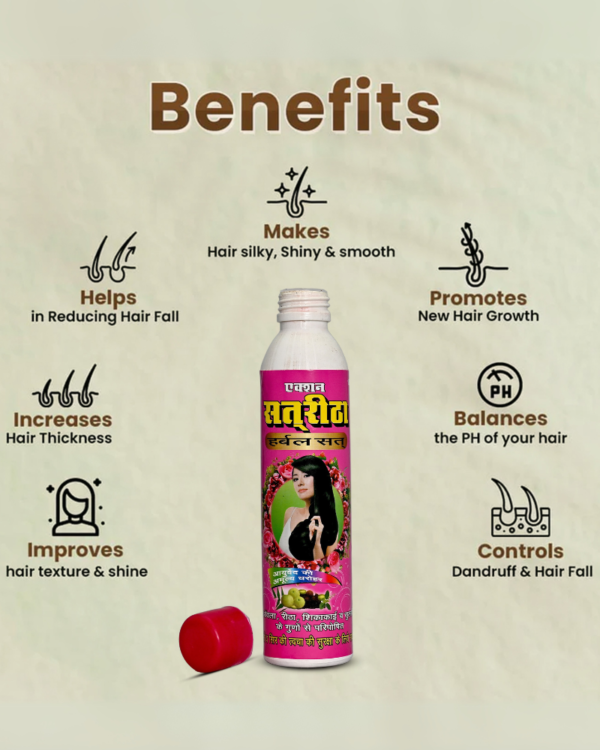 एक्शन सत्रीथा शैम्पू 100% आयुर्वेदिक और प्राकृतिक सामग्री से तैयार किया गया है, जिसमें रीठा, शिकाकाई और भृंगराज जैसी जड़ी-बूटियां शामिल हैं।