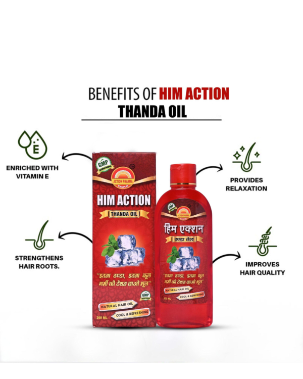 Hair Nourishment and Alopecia Care: Pamper your hair with Him Action Thanda Oil. Enriched with Brahmi, Amla, and Kapoor extracts, it nourishes hair follicles, promotes natural growth, and reduces hair fall. Its cooling effect soothes itchy scalps and relieves alopecia discomfort.