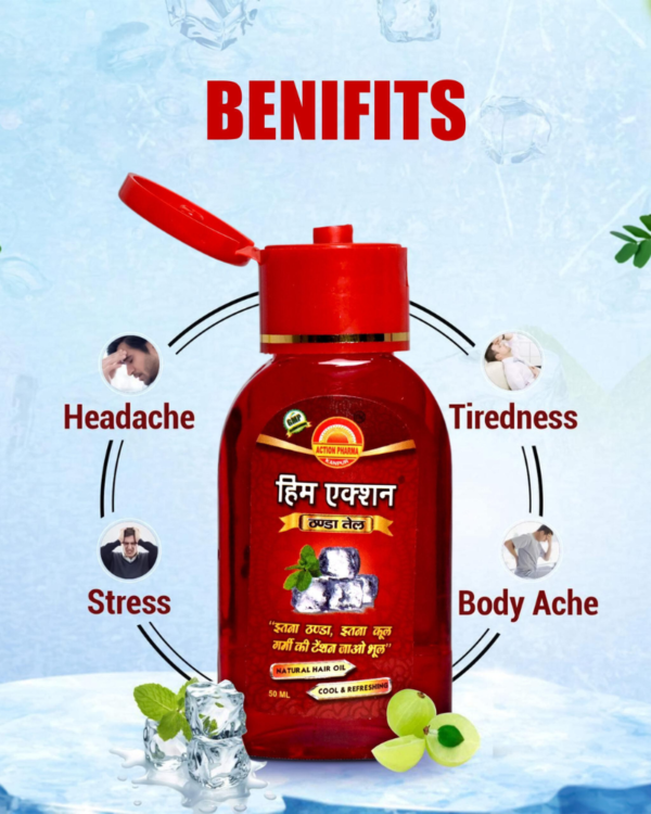 Head Relief: Him Action Thanda Oil’s cooling effect instantly calms and relaxes your mind, easing away the discomfort caused by headaches, migraines, and tension. The cooling sensation penetrates deep into the scalp, alleviating pain and promoting a sense of tranquility.