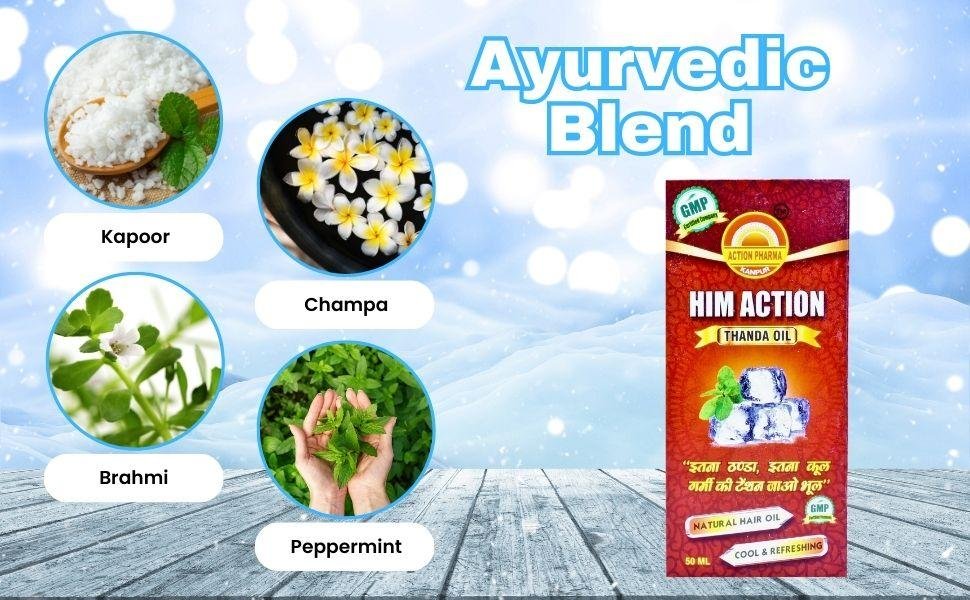 Experience cooling relief with Him Action Thanda Oil. This unique oil is formulated with a blend of active ingredients like Rattan Jot, Kapoor, Champa, Brahmi, aavla, peppermint, and more.It provides a cooling effect that soothes headaches, tension, and stress and promotes healthy hair.