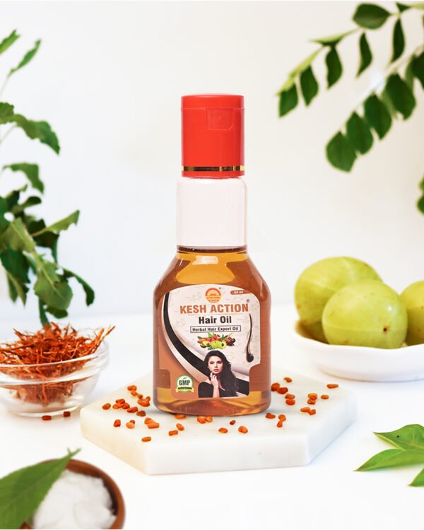 Dandruff and Dry Scalp Relief: Bid farewell to dandruff and dry scalp issues with Kesh Action Hair Oil. The soothing properties of Brahmi, Shikakai, and Tulsi work together to combat dandruff-causing agents, relieve dryness, and restore the scalp’s moisture balance. Enjoy a healthier, flake-free scalp and nourished hair.